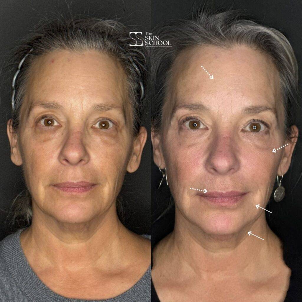 - Full-face neuromodulator injections, including the forehead, crow’s feet, gummy smile, chin, and neck lines